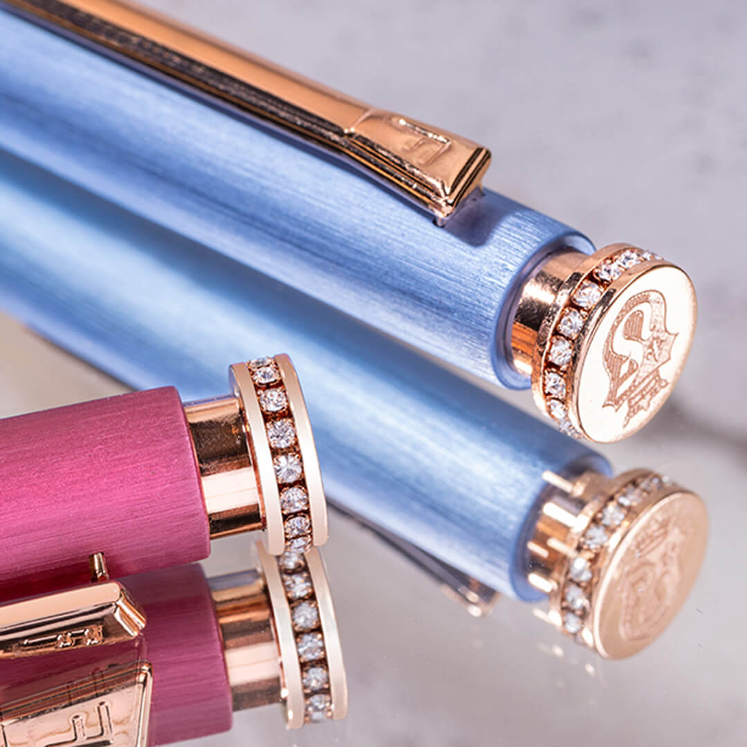 エレガントでモダンな女性をイメージしてデザインされました。 シルエットは滑らかでバランスが取れており、豪華なライトゴールドのトリムとブラッシュド(艶消し)アルミニウムのコントラストが絶妙です。クリップには頭文字のF、天冠上部にはフェスティナの紋章が刻印され、天冠を取り囲むクリスタルストーンが一層華やかさを添えています。