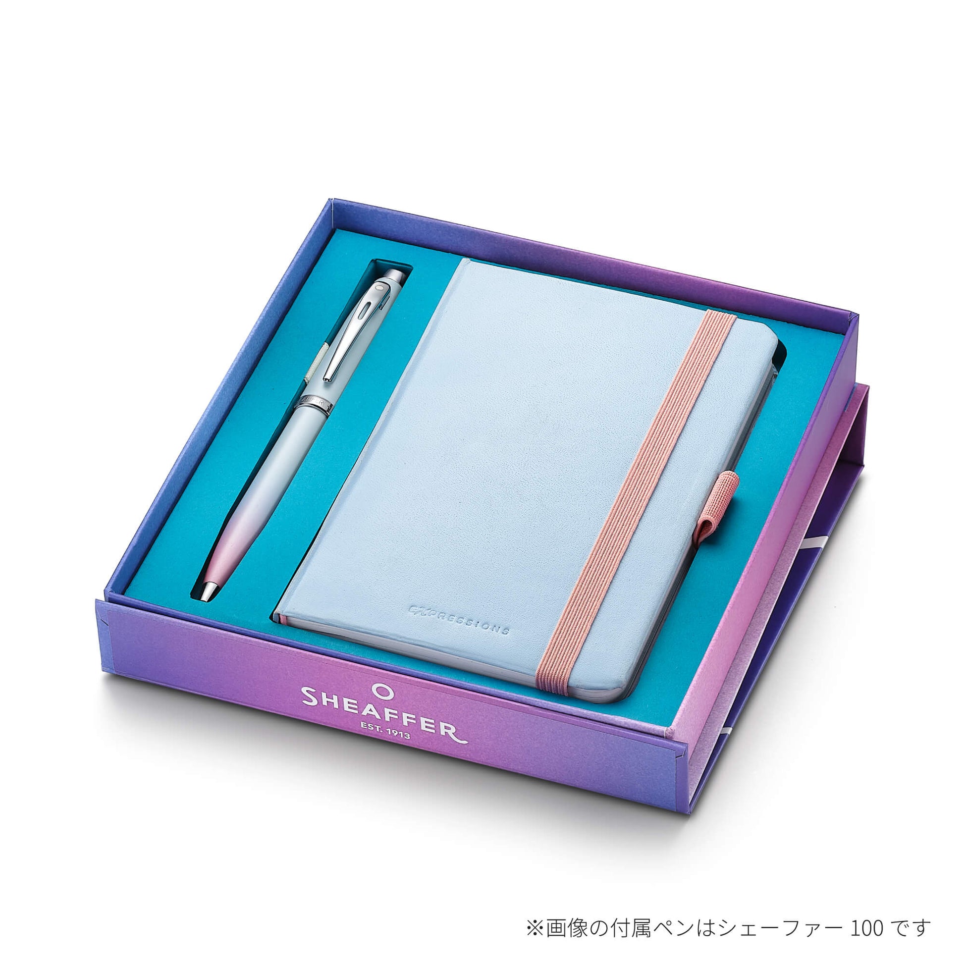 コンパクトサイズのノートは128ページで、FSC認証取得のインクフレンドリーな紙を採用。100シリーズの筆記具カラーと呼応するピンクとライトブルーの2色のパステルカラーで構成されており、インナーポケット、ゴムバンド、ペンループが備わっています。 存在感を放つギフトボックスは、エレガントでありながら鮮やかでダイナミック。自らの言葉で人生の道を切り拓く人々に、シェーファーが贈るギフトセットです。 ※画像の付属ペンはシェーファー100です。